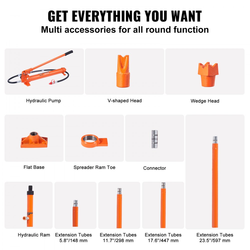 Ideálne pre všetky vaše potreby: Prenosná súprava hydraulického piestu obsahuje všetko, čo potrebujete na dokončenie opravy! Hydraulické čerpadlo, hydraulický piest, 3 ks predlžovacích rúrok, hlava v tvare V, klinová hlava, konektor, plochá základňa, špička rozperného piestu. Budete pripravení pustiť sa do akéhokoľvek projektu bez námahy.