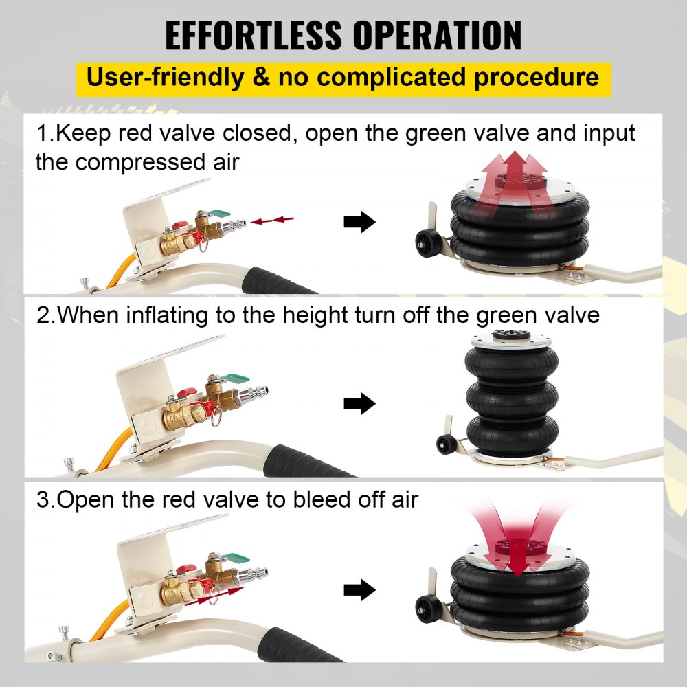 Zdvihák šetriaci prácu: Kapacita pneumatického zdviháka: 11000 lbs/5T. Minimálna výška: 6,3"/ 160 mm. Maximálna výška: 15,75"/400 mm. Zdvihnutie trvá len 5 sekúnd. Pracovná teplota: -60 ℃ ~ 50 ℃. Vstup vzduchu: G1/4. Náš trojitý zdvihák je najjednoduchší a najrýchlejší spôsob, ako zdvihnúť auto.