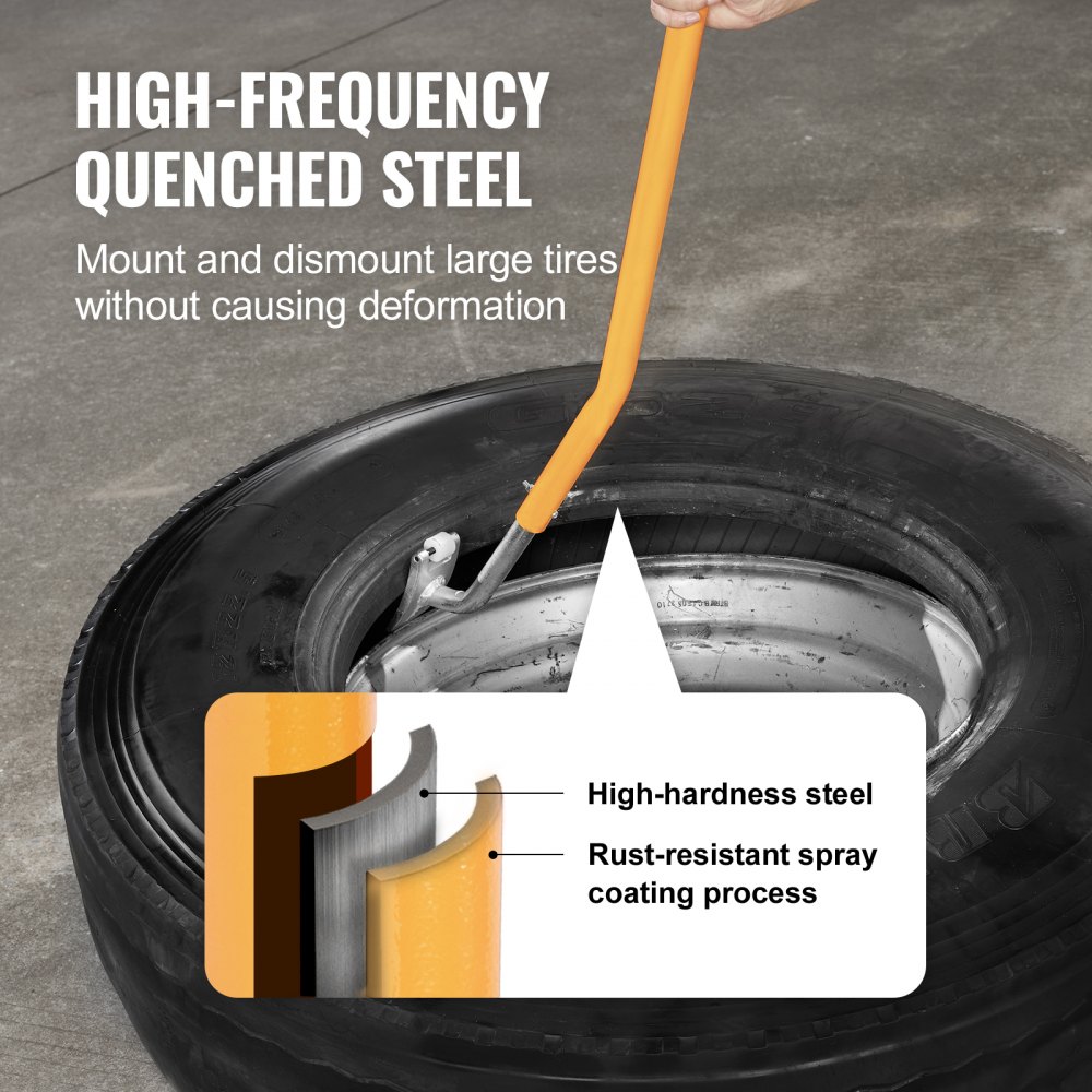 Užívateľsky prívetivé ovládanie: Zažite jednoduchú demontáž pneumatiky jednoduchým krokom. Demontážne nástroje na pneumatiky majú gumený obal s pohodlným úchopom. Vďaka princípu páky môžete ľahko manipulovať s ťažkými pneumatikami bez pocitu únavy.