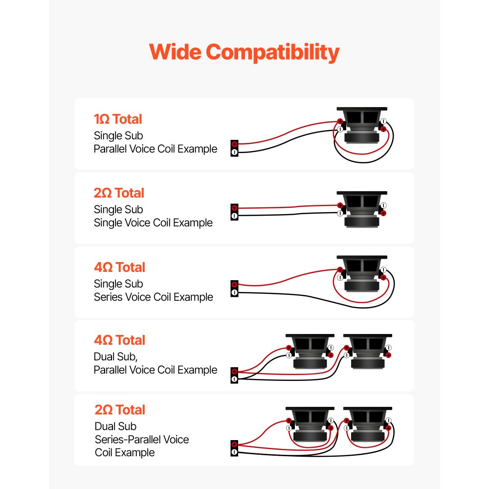 Široká kompatibilita: Tento zosilňovač autorádia funguje s väčšinou továrenských autorádií pre sedany a pick-upy, podporuje záťaže 1/2/4Ω a flexibilné zapojenie. Je kompatibilný s 10-palcovými a 12-palcovými subwoofermi s jednou/dvojitou cievkou. Inštalácia svojpomocne je jednoduchá.