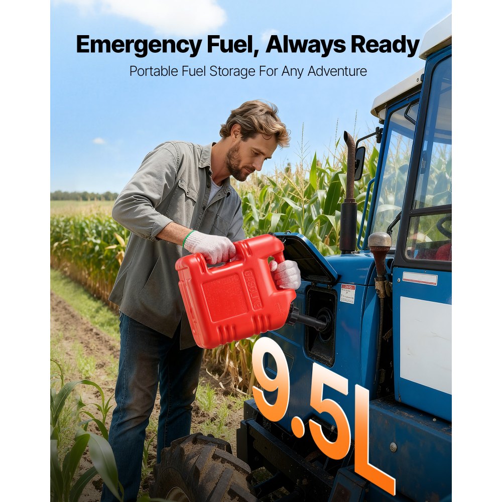 Nádoba na palivo VEVOR, 9,5 l, nádrž na plyn s výlevkou a priehľadnou stupnicou, maximálny prietok 15 l/min, bezpečná a nepriepustná, prenosná plochá nádoba na kvapaliny pre väčšinu áut, motocyklov, štvorkoliek, UTV, červená, 1 balenie