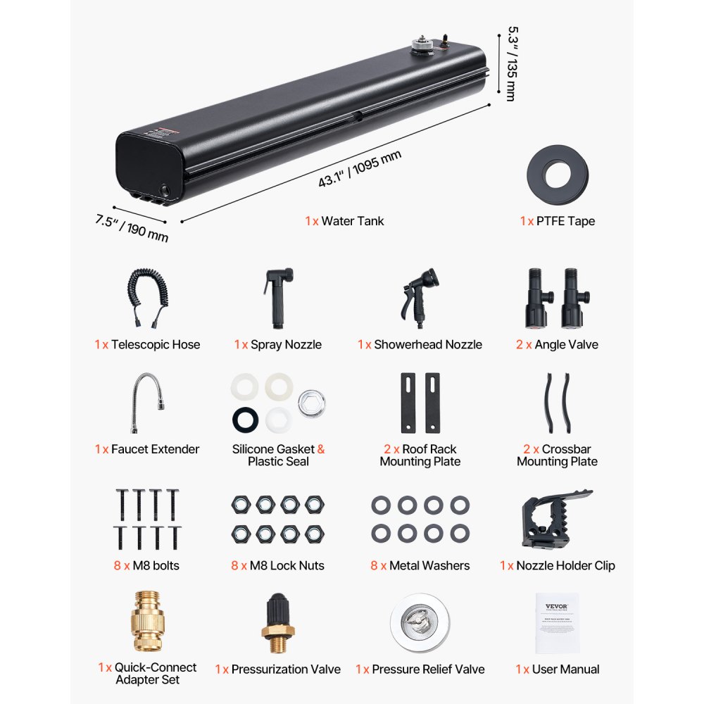 Nádrž na vodu pre strešný nosič VEVOR, 4,5 galóna, viacúčelová vonkajšia nádrž s 2 ochrannými panelmi proti striekajúcej vode a T-drážkou, vysokokapacitná hliníková nádrž s pretlakovým otvorom, vhodná pre kufre, ochranné rámy a priečky.