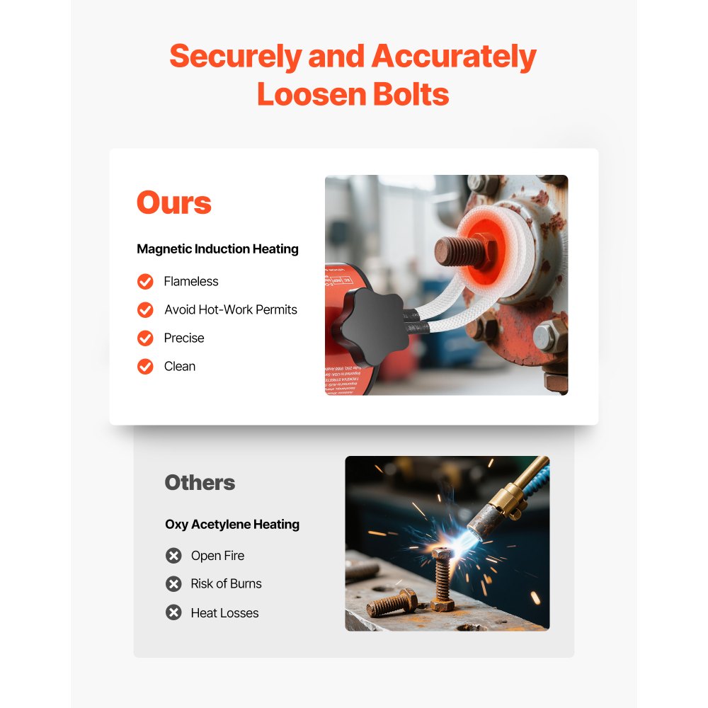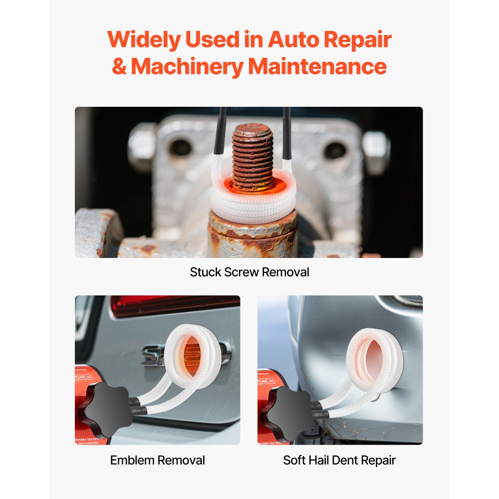 Rýchla demontáž: Vysokofrekvenčné elektromagnetické ohrevné pole s výkonom 1500 W umožňuje kovu rýchle roztiahnutie v priebehu 25 sekúnd, čo uľahčuje jeho demontáž. Ohrievač skrutiek neprodukuje plamene, nevyžaduje vodné chladenie.