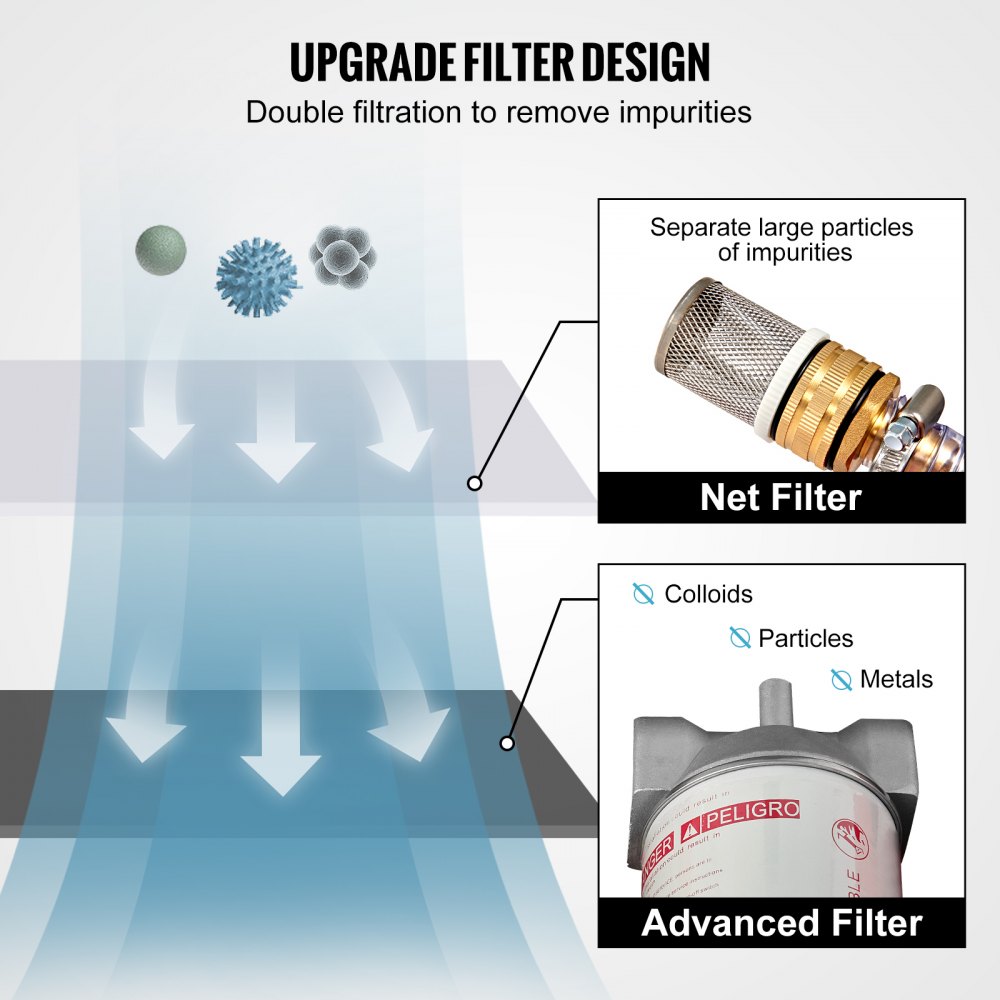 Vylepšený dizajn filtra: V porovnaní s inými produktmi je naša palivová nádrž vybavená duplexným filtrom, ktorý ponúka čistejšiu naftu. Predný filter vnútornej nádrže dokáže oddeliť veľké častice nečistôt a prémiový vonkajší filter je určený na filtráciu malých nečistôt, ako sú kovy, koloidy, drobné častice atď.