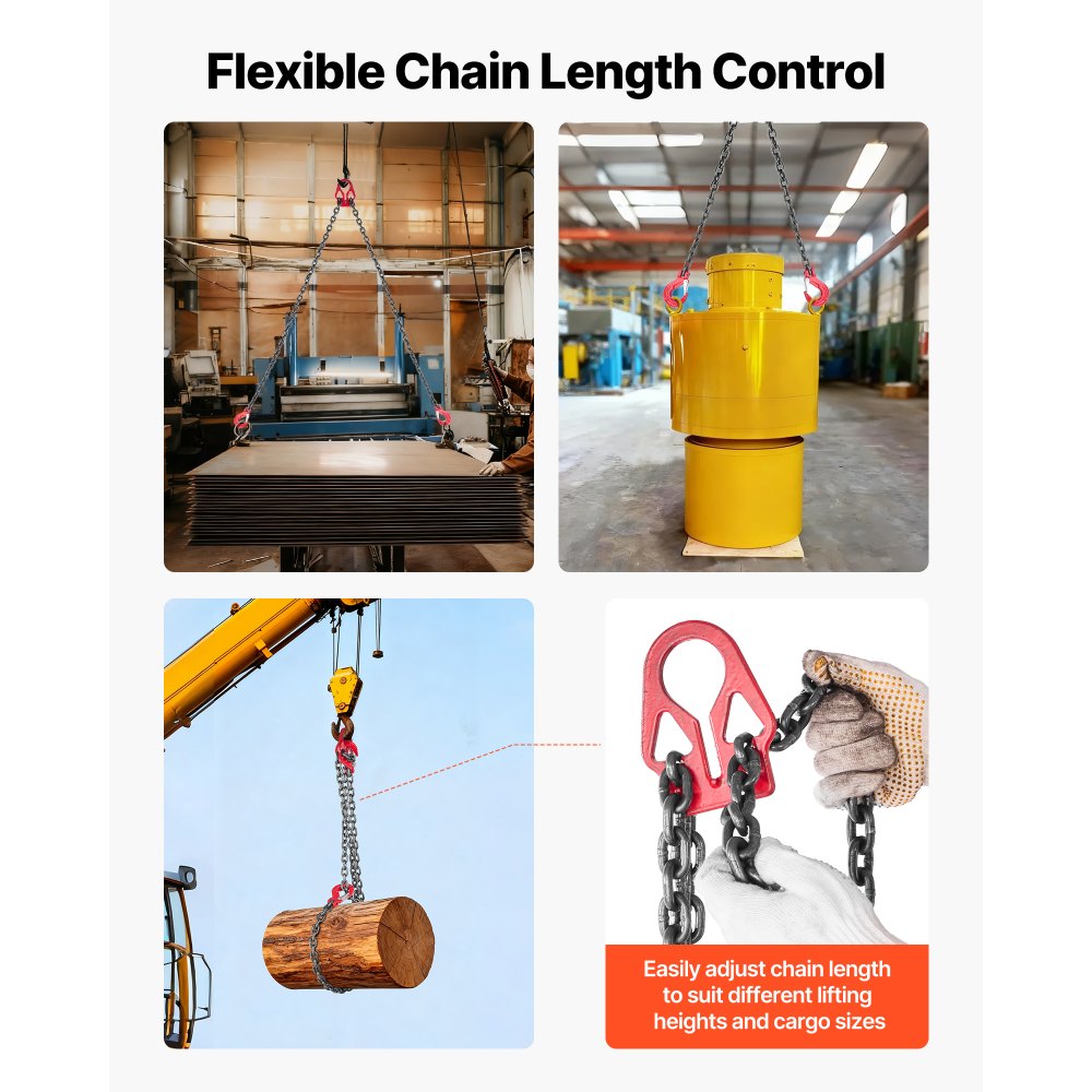 Nastaviteľná dĺžka reťaze: Naša zdvíhacia reťaz je vybavená 2 nastaviteľnými hákmi a umožňuje vám jednoducho meniť dĺžku zdvihu tak, aby vyhovovala rôznym veľkostiam bremien a uhlom zdvihu. Poznámka: Uistite sa, že bremeno je vycentrované na háku. Nevešajte predmety za okraj háku. Zdvíhaciu reťaz nekrúťte, neprevraciajte ani nezamotávajte.