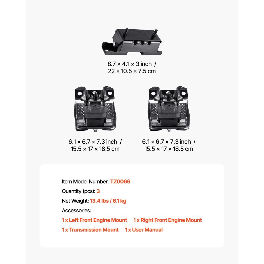 Kompletná sada na upevnenie motora: Táto sada na upevnenie motora obsahuje 3 diely: ľavý predný (A5365), pravý predný (A5365) a držiak prevodovky (A2638), ktoré poskytujú bezpečnú oporu pre stabilitu motora a zníženie vibrácií.