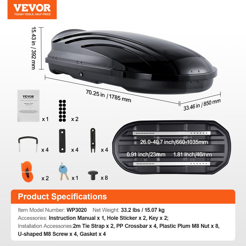 Strešný nosič VEVOR, strešný box s objemom 11 kubických stôp, strešný box s tvrdou škrupinou ABS, s obojstranným otváraním a 2 vystuženými popruhmi, aerodynamický, vhodný pre väčšinu priečnych nosníkov, pre osobné autá, kombi, SUV, čierny