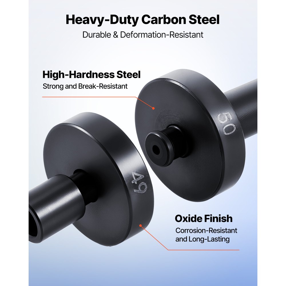 Odolnosť pri vysokých zaťaženiach: Nástroj na uťahovanie je vyrobený z vysoko tvrdej ocele so zosilnenými objímkami kotúčov, ktoré odolávajú silným úderom kladív alebo sekáčov. Naša sada puzdier na uťahovanie puzdier má oxidovaný čierny povlak pre odolnosť voči hrdzi, opotrebovaniu a dlhú životnosť.
