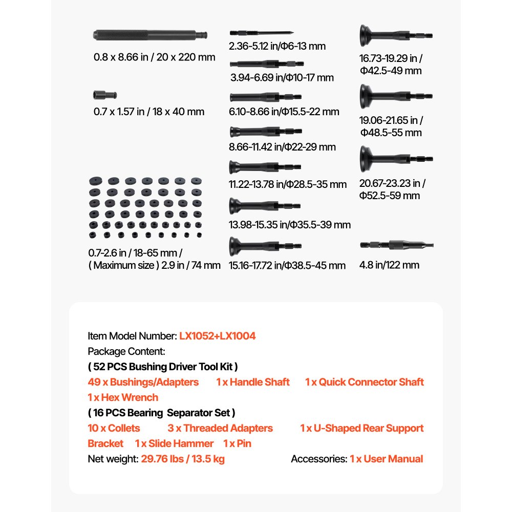 Súprava na lisovanie ložísk VEVOR, 52+16 ks, 2 v 1 nástroj na uťahovanie puzdier a súprava na lisovanie ložísk, sada uťahovákov na tesnenia a krúžky so 49 puzdrami, 10 klieštinami, posuvným kladivom, sada na demontáž a inštaláciu pre vysoké zaťaženie s puzdrom