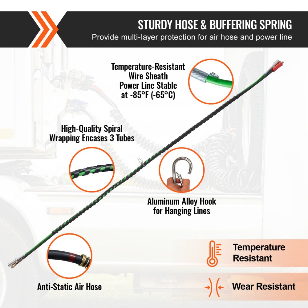 Súprava vzduchových hadíc VEVOR 12FT pre ťahač návesov, 3-v-1 vzduchové hadice a napájacie vedenie ABS pre ťahač návesov, 7-cestná zástrčka, elektrický kábel a súprava gumových vzduchových hadíc s hákom a teflónovou páskou - Auto-moto