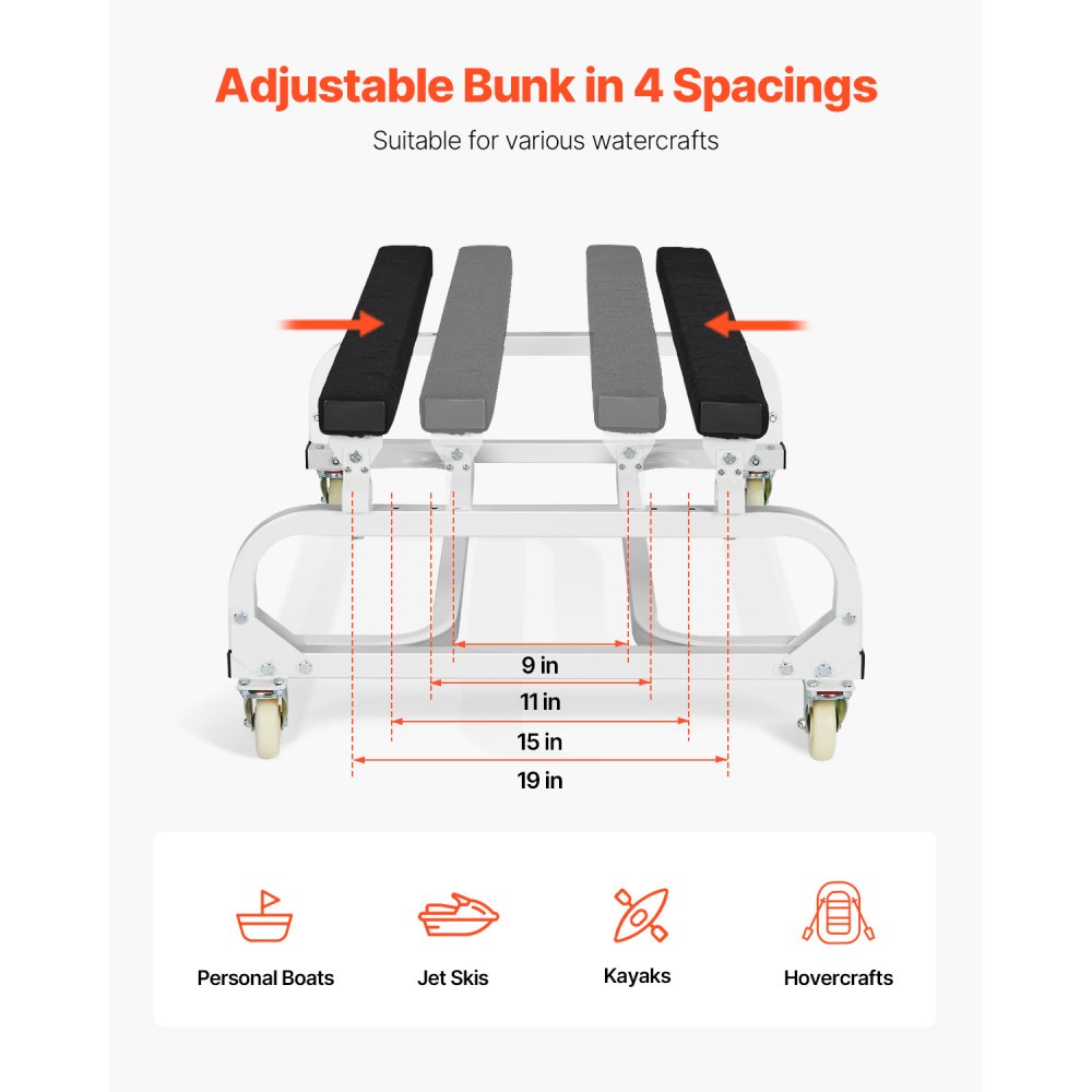 Nastaviteľný rozstup: Rozstup aj uhol sú nastaviteľné, čo zlepšuje kompatibilitu s rôznymi dnami lodí. Táto funkcia vozíka pre plavidlá vyhovuje potrebám skladovania a prepravy malých až stredne veľkých lodí, ako sú vodné skútre, kajaky, nafukovacie člny a plachetnice.
