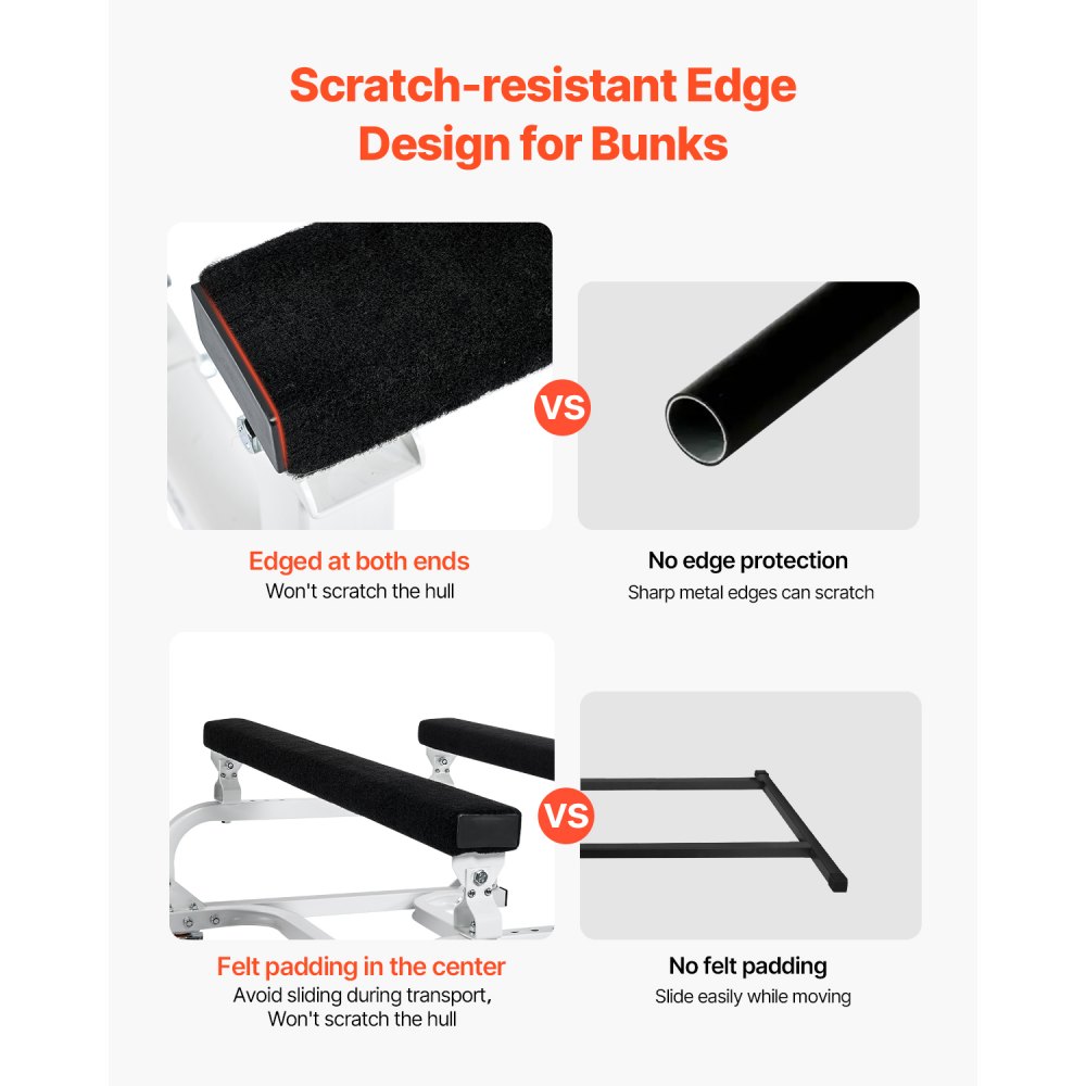 Ovinutie okrajov lôžok: Mäkká plsť úplne pokrýva lôžka, čím účinne zabraňuje poškriabaniu lode a poskytuje dodatočné trenie, aby sa predišlo šmýkaniu. Plsť tiež dodáva estetický nádych vzhľadu vozíka pre vodný skúter.