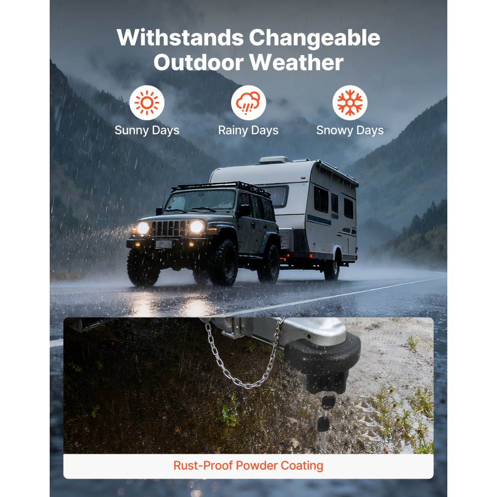 Odolnosť voči hrdzi: Toto guľové ťažné zariadenie s uzáverom prívesu má povrch s práškovým náterom odolným voči hrdzi a korózii, ktorý odoláva vonkajším poveternostným podmienkam. Dokáže si udržať stabilný výkon aj pri páliacom slnku, silnom daždi alebo mrznúcom snehu.