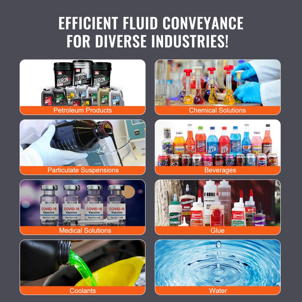 Vhodné pre rôzne kvapaliny: Naše čerpadlo na odpadový olej je schopné spracovať širokú škálu kvapalín od odpadového oleja, alkoholu, hydraulického oleja, benzínu, nafty a čistiacich prostriedkov až po nápoje. Jeho rozsiahle uplatnenie zahŕňa rôzne odvetvia vrátane ropného priemyslu, hutníctva, baníctva, náterov, tlače, úpravy vody a automobilového priemyslu. Bez ohľadu na vaše odvetvie a kvapalinu, naše membránové čerpadlo je skonštruované tak, aby s ňou manipulovalo s bezkonkurenčnou účinnosťou a spoľahlivosťou.