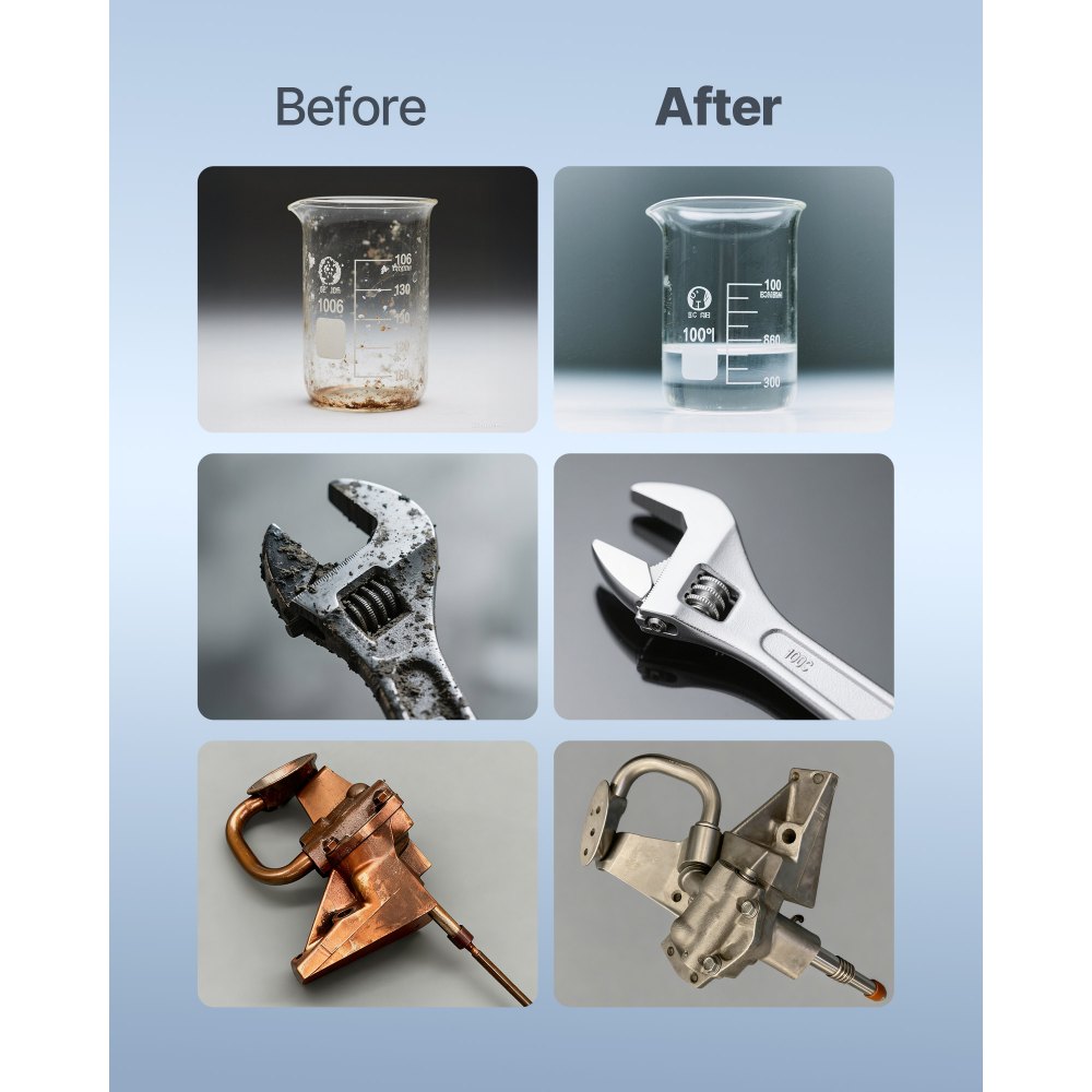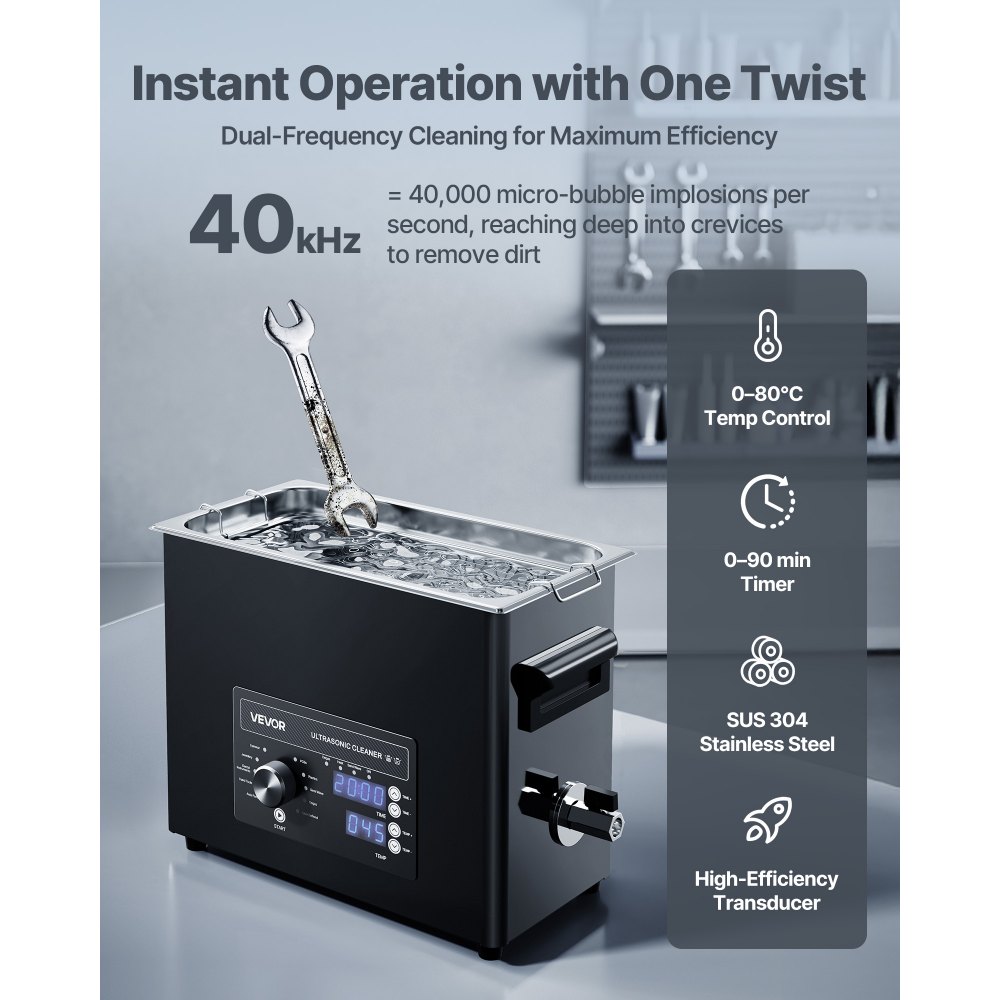 Výkonné čistenie: Ultrazvukové vlny s frekvenciou 40 kHz vytvárajú mikrobubliny, ktoré rýchlo odstraňujú oleje a častice z ťažko dostupných miest, ako sú karburátory, trysky rozprašovača a malé diely. Pre optimálne výsledky používajte s neutrálnym čistiacim prostriedkom a teplou vodou.