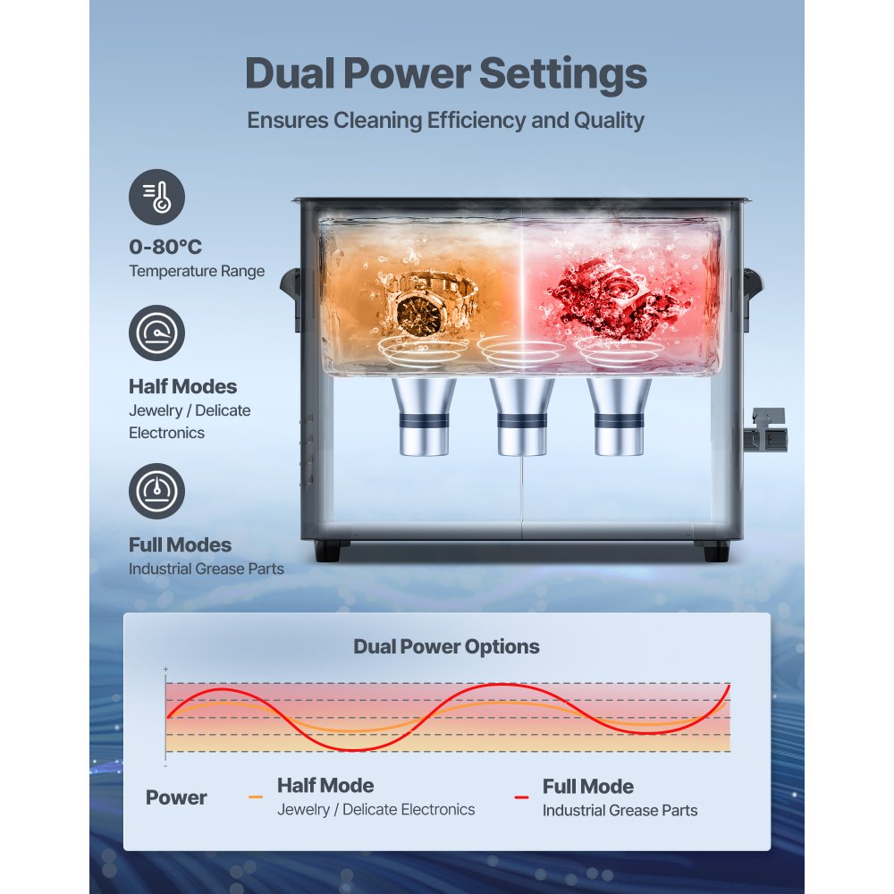 Duálne režimy výkonu: Režim odplyňovania tohto ultrazvukového čističa odstraňuje vzduch z kvapalín, čím zvyšuje účinnosť o 30 %. Duálne nastavenia výkonu poskytujú presné čistenie chúlostivých predmetov alebo náročných dielov bez poškodenia.