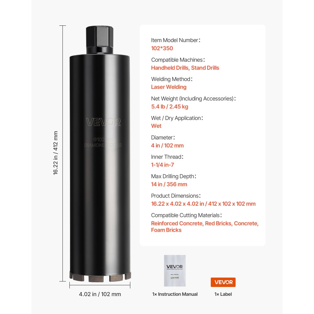 Jadrový vrták VEVOR, priemer 102 mm, hĺbka vŕtania 356 mm, vnútorný závit 1-1/4 in-7, technológia vysoko presného zvárania, diamantový jadrový vrták za mokra pre železobetón, červené tehly a murivo - Domáce zvieratá
