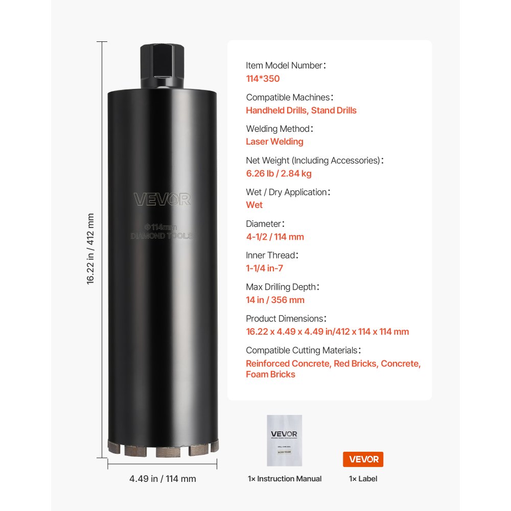 Jadrový vrták VEVOR, priemer 114 mm, hĺbka vŕtania 356 mm, vnútorný závit 1-1/4 in-7, technológia vysoko presného zvárania, diamantový jadrový vrták za mokra pre železobetón, červené tehly a murivo - Domáce zvieratá
