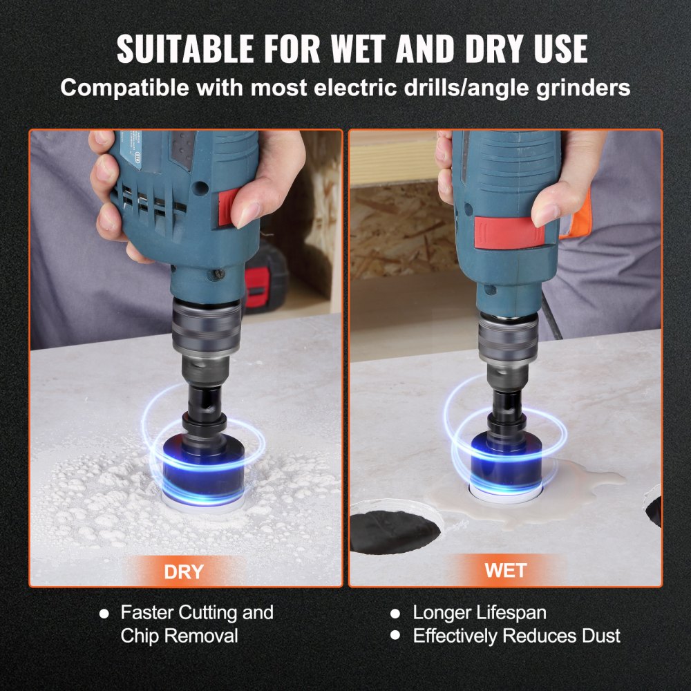 Široké použitie: Náš diamantový vrták je kompatibilný s elektrickými vŕtačkami a uhlovými brúskami na suché aj mokré vŕtanie. Či už potrebujete rezať dlaždice, žulu, mramor alebo iné tvrdé materiály, v rôznych situáciách si poradí s obdivuhodnými výkonmi.