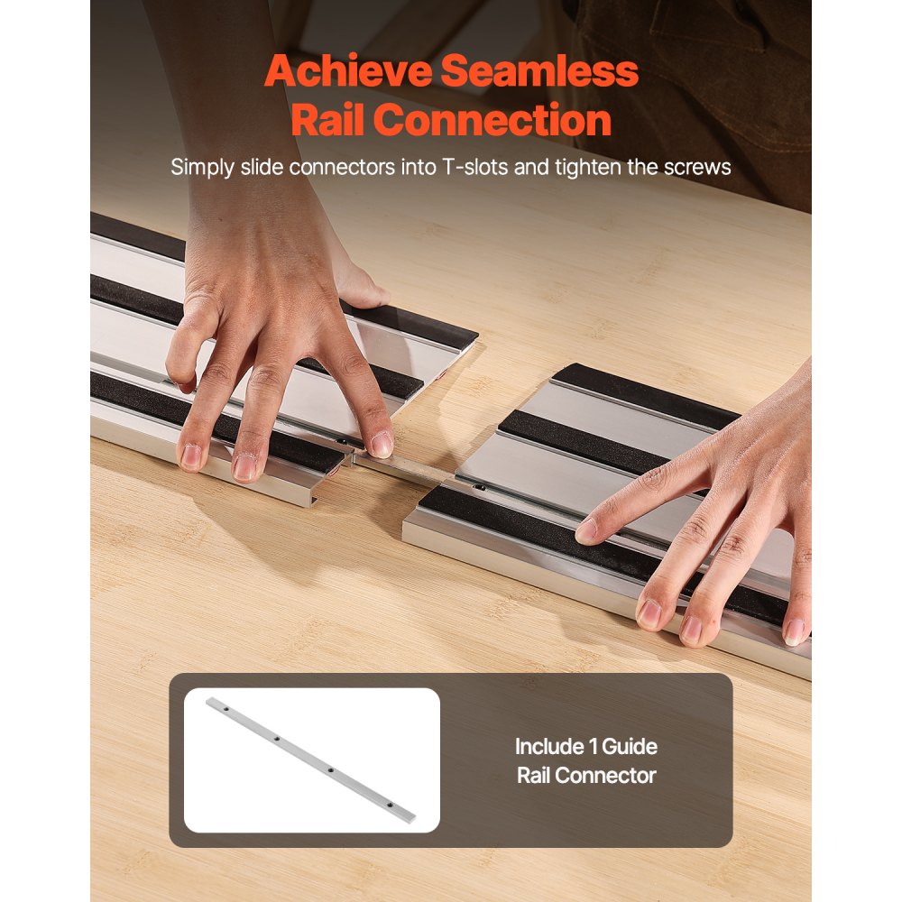 Vodiaca lišta pre pílu VEVOR, rezný rozsah 1397 mm (55 palcov), obsahuje 2 ks hliníkových extrudovaných vodiacich líšt s dĺžkou 699 mm (27,5 palcov) a 1 konektor, kompatibilná s pílami Makita, Festool a WEN, pre dlhšie rezy dreva