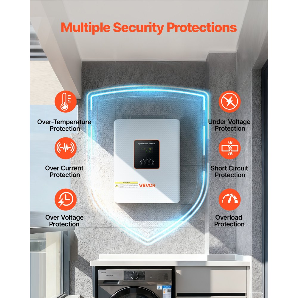 Komplexná ochrana: Zahŕňa ochranu proti prehriatiu, nadprúdu, prepätiu, podpätiu, skratu a preťaženiu. Tento hybridný solárny invertor mimo siete zaisťuje bezpečnú prevádzku vašich obvodov a napájania.