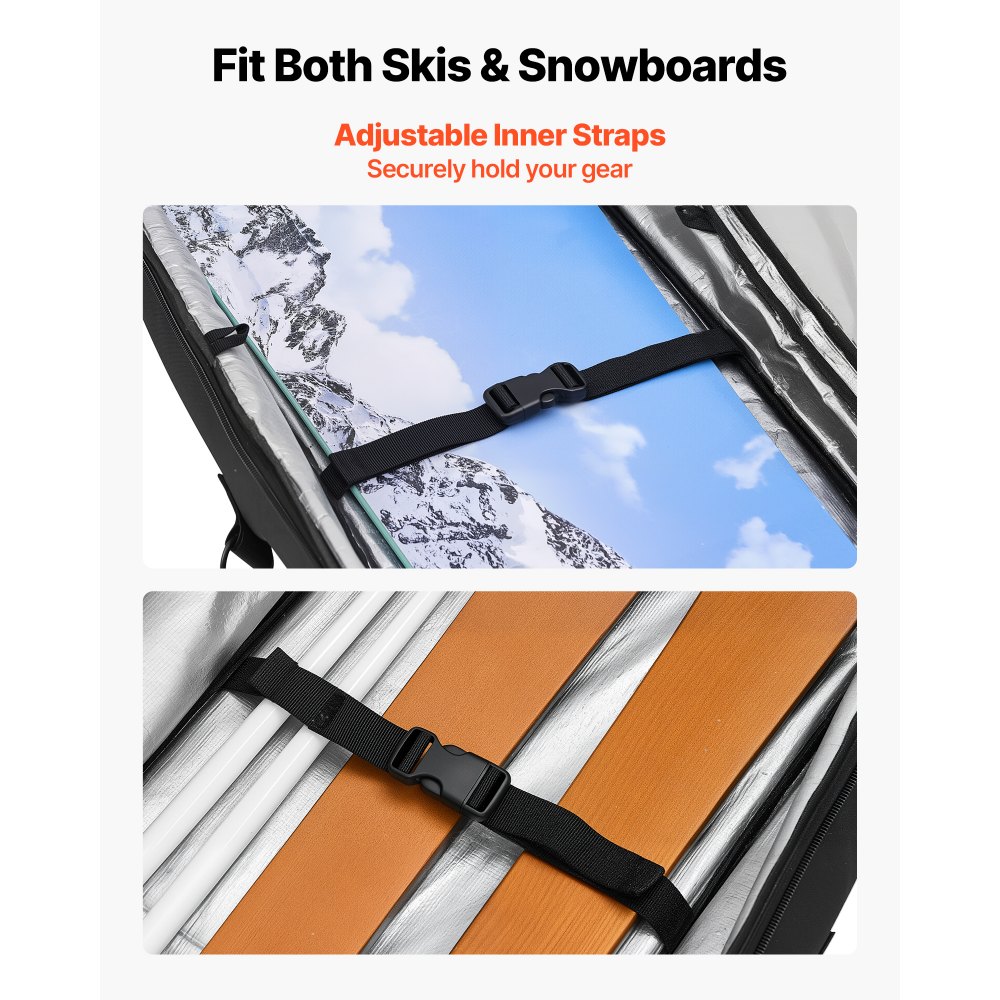 Taška na lyže VEVOR na kolieskach, do 175 cm, polstrovaná taška na snowboard s kolieskami na cestovanie lietadlom, vodeodolná oxfordská tkanina 600D, s nastaviteľnými popruhmi, na lyže, palice, okuliare, rukavice, prilbu, topánky (čierna)
