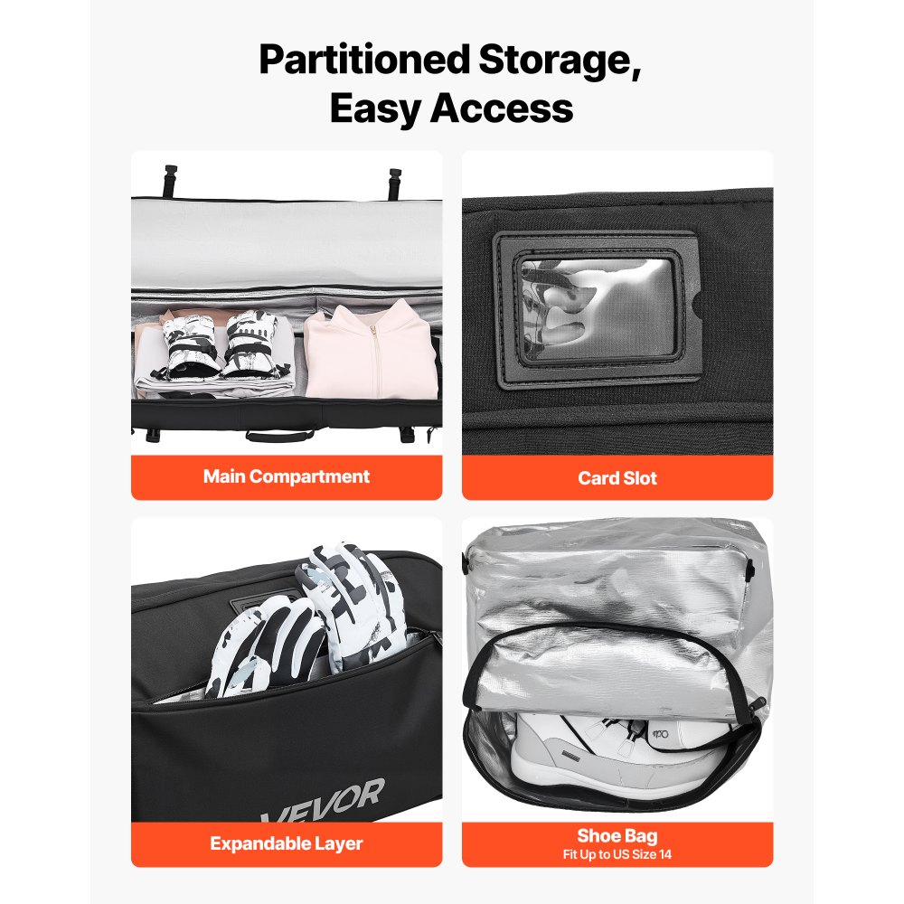 Taška na lyže VEVOR na kolieskach, do 74,8 palca/190 cm, polstrovaná taška na snowboard s kolieskami na cestovanie lietadlom, vodeodolná oxfordská tkanina 600D, s nastaviteľnými popruhmi, na lyže, palice, okuliare, rukavice, prilbu, topánky (čierna)