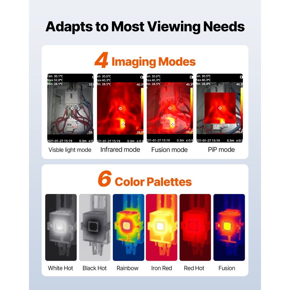 Termokamera VEVOR, TISR Super rozlíšenie 240x180, termokamera s 2MP vizuálnou kamerou, rozlíšenie IR 96x96, obnovovacia frekvencia 25 Hz, -4 °F až 1022 °F, 4 režimy obrazu a 6 farebných paliet