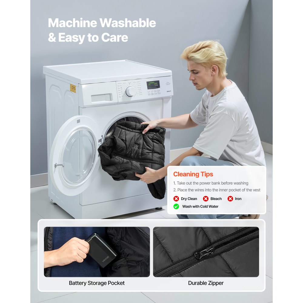 Fácil cuidado: El chaleco calefactable es lavable a máquina, por lo que es muy fácil de limpiar. Retire la batería externa y guarde los cables del chaleco en el bolsillo interior antes de lavarlo