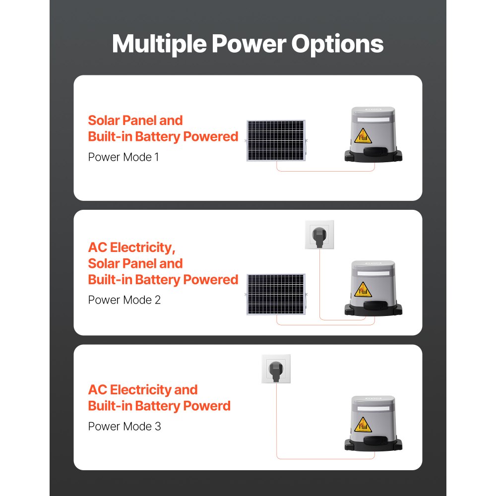 Potente rendimiento y alta capacidad de carga: Equipado con un motor de 280 W y una velocidad de 2400 rpm, este abridor de puerta solar admite puertas de hasta 20 m de ancho y 816 kg de peso, lo que garantiza un funcionamiento suave y confiable para puertas residenciales, agrícolas o comerciales