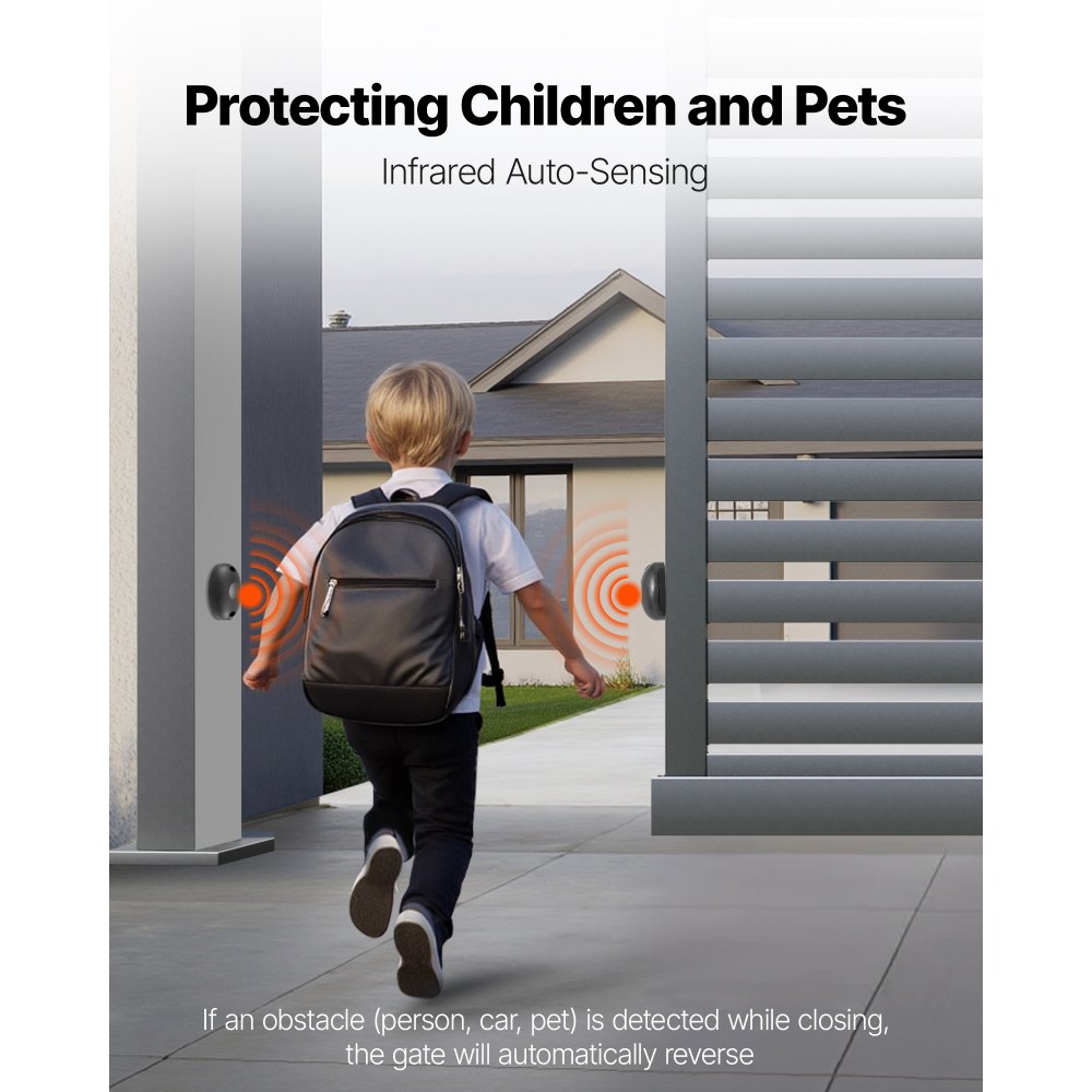 Funciones de seguridad inteligentes: El abridor automático de portones está equipado con sensores infrarrojos. Cuando el sensor infrarrojo detecta una persona o un vehículo, el portón retrocede automáticamente para evitar colisiones accidentales y garantizar la seguridad de sus hijos y mascotas