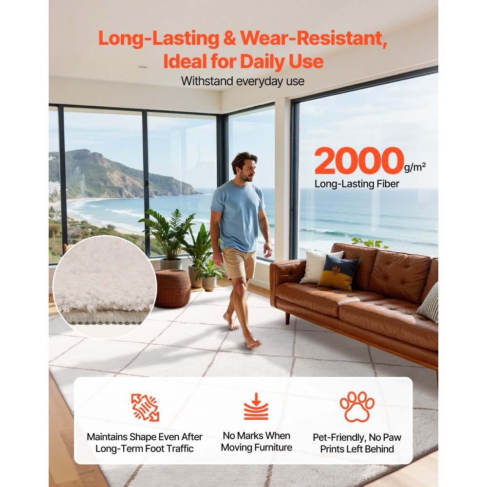 Construcción de fibra duradera: Esta alfombra de salón está hecha de fibras gruesas de alta densidad de 2000 g/m² y resiste el tránsito intenso sin deformarse. Incluso evita marcas profundas bajo los muebles, lo que la hace ideal para espacios de mucho tránsito como salas de estar o salas de estar