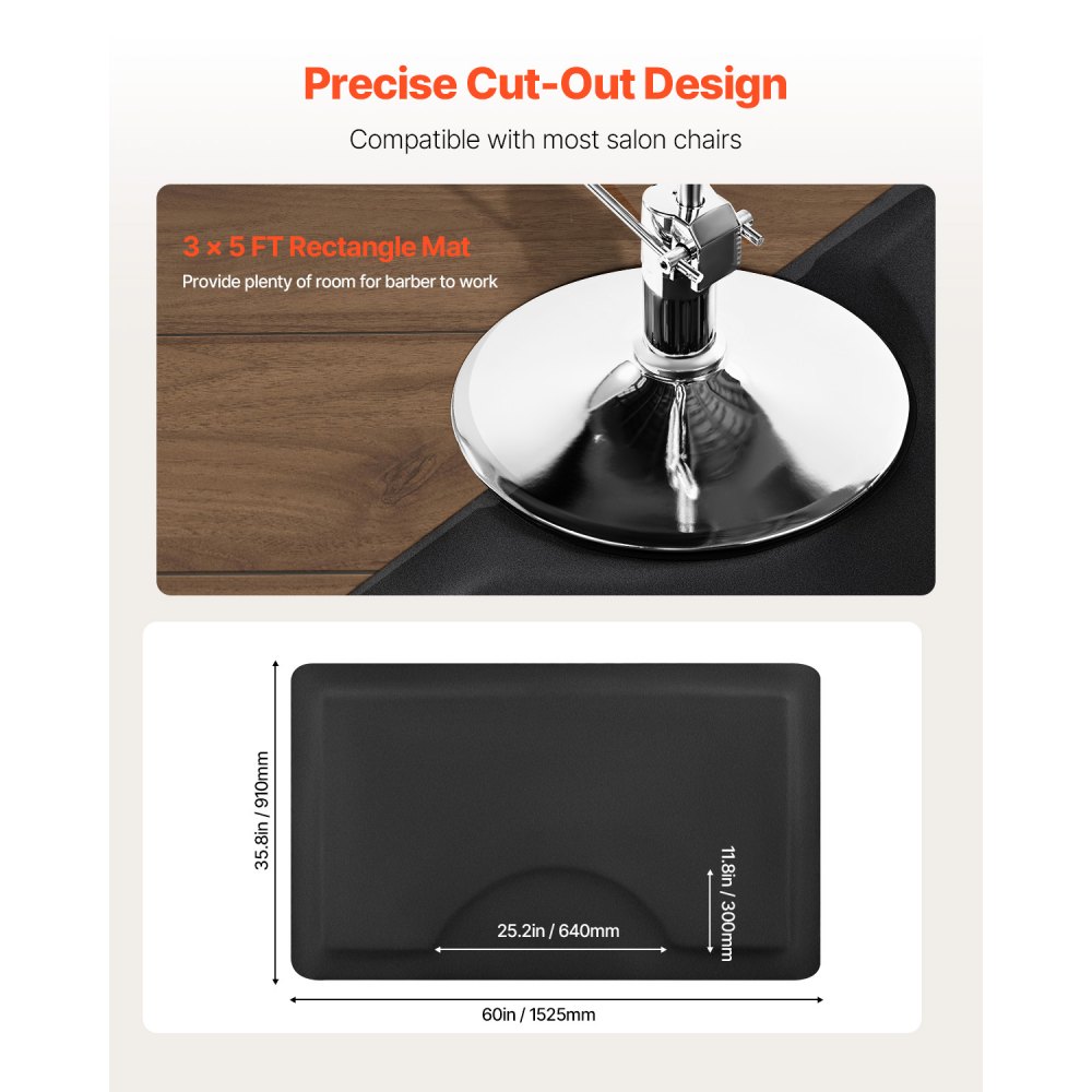 Tamaño grande: Nuestra alfombra rectangular de 1525 x 910 mm para estilistas ofrece una amplia zona de pie, lo que permite a los barberos moverse con libertad y trabajar con mayor eficiencia. El recorte de 640 x 300 mm se adapta a la mayoría de las sillas de salón con base redonda, manteniéndose firmemente en su lugar sin moverse
