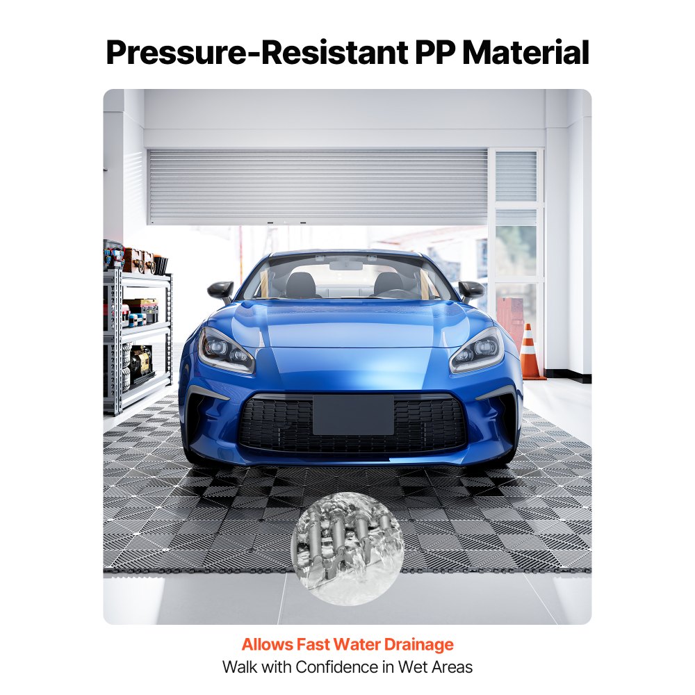 Material flexible y duradero: Fabricadas con PP mejorado, estas baldosas para suelo de garaje entrelazadas son resistentes a la corrosión, al desgaste y a la deformación, y al mismo tiempo son flexibles de doblar. Garantiza un rendimiento duradero incluso en entornos con humedad constante