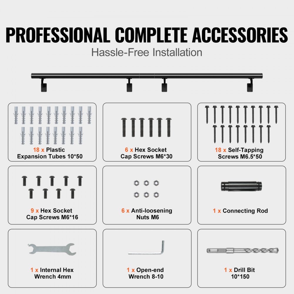 Accesorios completos: Este pasamanos de escalera viene con accesorios especializados, lo que garantiza un proceso de instalación simple y conveniente. No es necesario comprar piezas ni herramientas adicionales. Simplemente siga las instrucciones y podrá instalar fácilmente el pasamanos, ahorrando tiempo y esfuerzo.