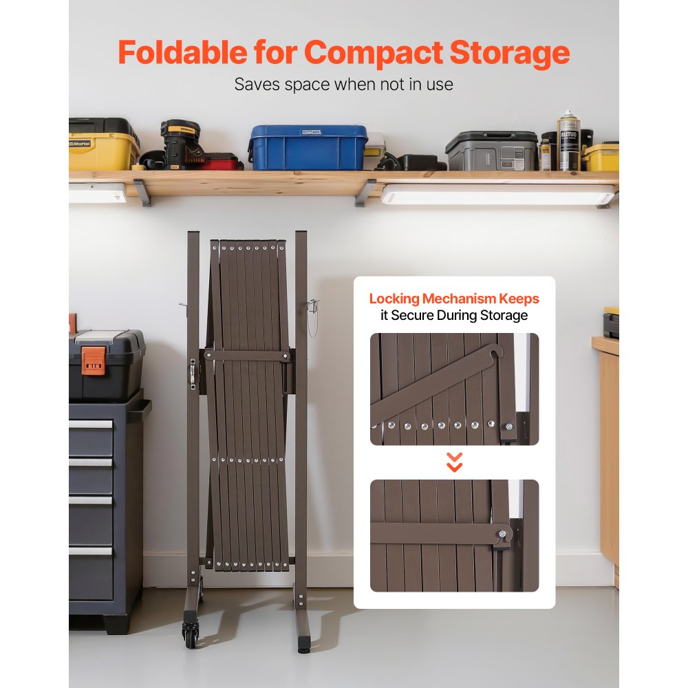Movilidad suave y bloqueo seguro: Equipada con 2 ruedas con freno, esta barrera plegable se desplaza con suavidad por diferentes superficies y se bloquea de forma segura para garantizar una posición estable. Además, sus 2 patas niveladoras ajustables mejoran la estabilidad en superficies irregulares