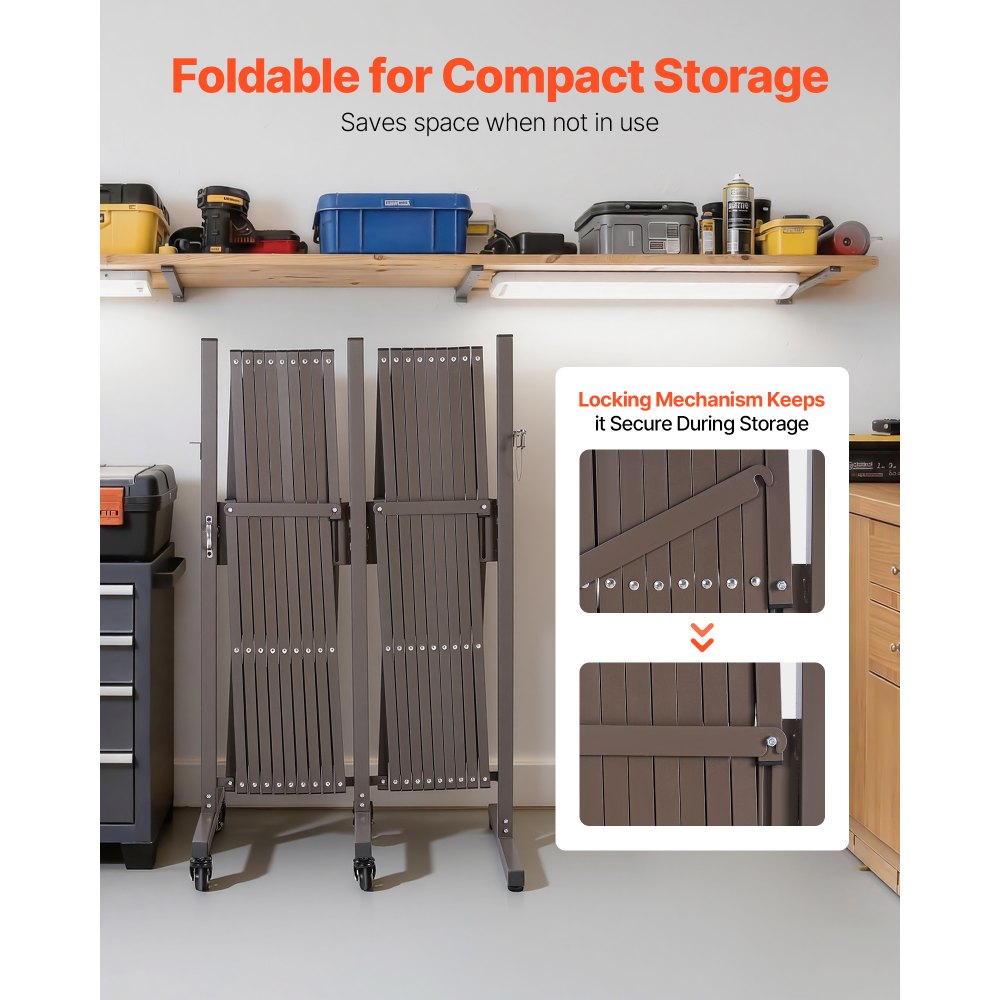 Movilidad suave y bloqueo seguro: Equipada con 4 ruedas bloqueables, esta barrera plegable se desliza suavemente sobre diferentes superficies y se bloquea de forma segura para una posición estable. Sus 2 patas niveladoras ajustables mejoran la estabilidad en superficies irregulares