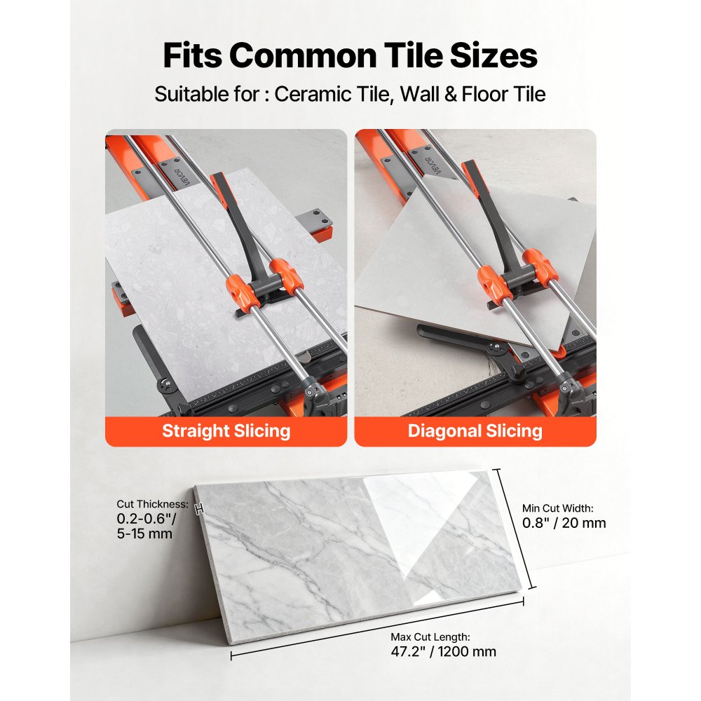 Compatible con tamaños comunes de baldosas: Esta cortadora de baldosas permite realizar cortes rectos y diagonales en formatos comunes. Admite baldosas de cerámica para pared y suelo con una longitud máxima de corte de 120 cm, un ancho mínimo de corte de 2 cm y un rango de espesor de 5 a 15 mm