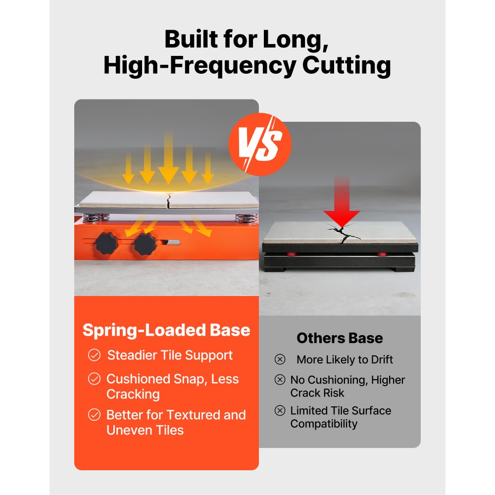 Base con resorte: Diseñada para uso frecuente, esta cortadora de azulejos cuenta con una base con resorte que mantiene los azulejos estables durante el marcado y la rotura, distribuye la presión de forma uniforme y ayuda a reducir el agrietamiento, especialmente en superficies irregulares o texturizadas