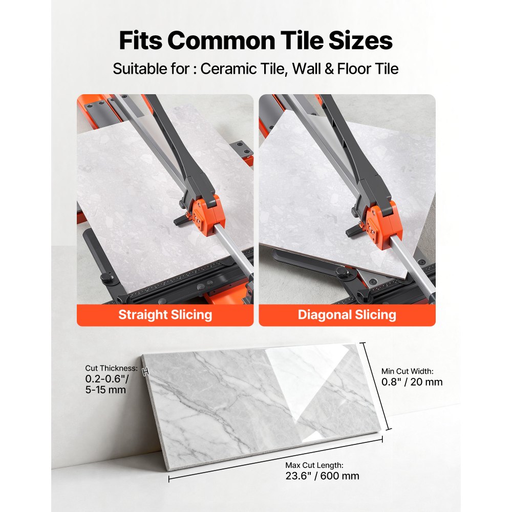 Compatible con tamaños comunes de baldosas: Esta cortadora de baldosas permite realizar cortes rectos y diagonales en formatos comunes. Admite baldosas de cerámica para pared y suelo con una longitud máxima de corte de 59,4 cm, un ancho mínimo de corte de 20,3 cm y un rango de espesor de 5 a 15 mm
