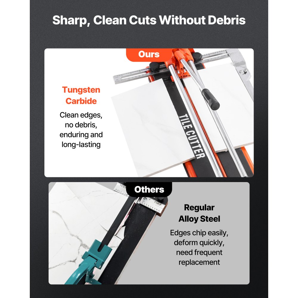 Corte preciso: Consiga cortes precisos con la cortadora de azulejos. El cabezal deslizante con nervaduras metálicas y rodamientos de bolas garantiza un rayado suave y un corte preciso de azulejos. Equipado con una escala y reglas de ángulos para una medición y posicionamiento precisos