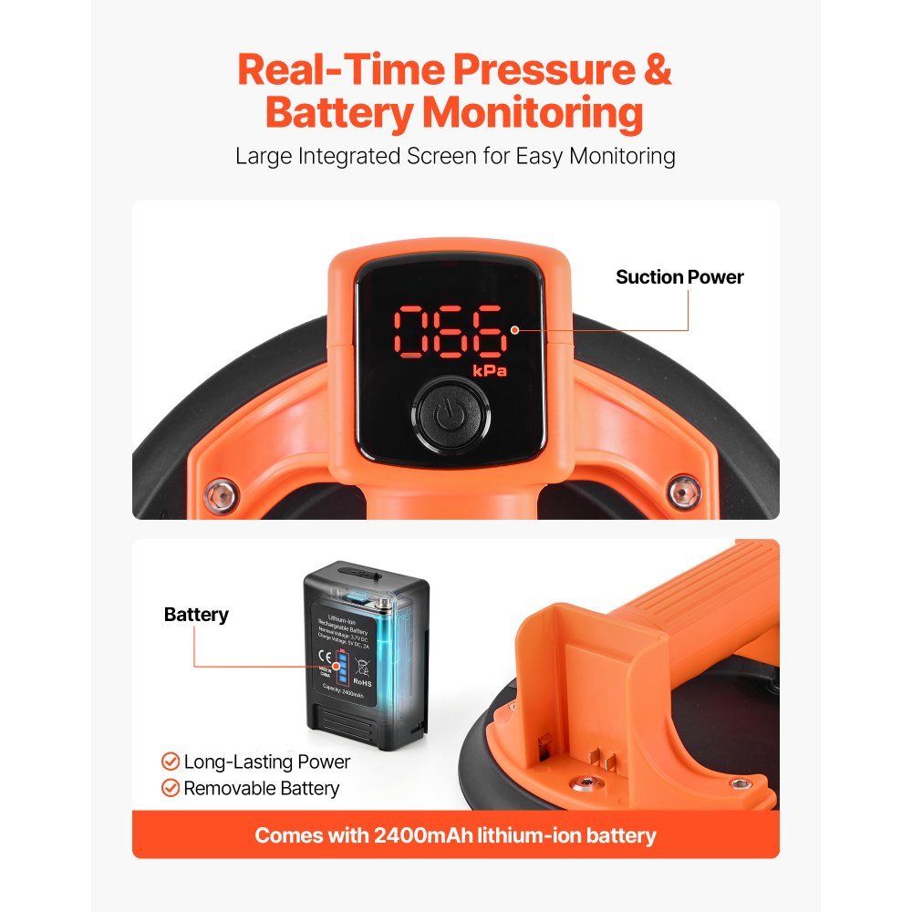 Indicador de presión y batería: La pantalla digital del elevador de vacío muestra los niveles actuales de vacío y batería, lo que le permite controlar la presión y la carga en tiempo real y planificar fácilmente cada elevación