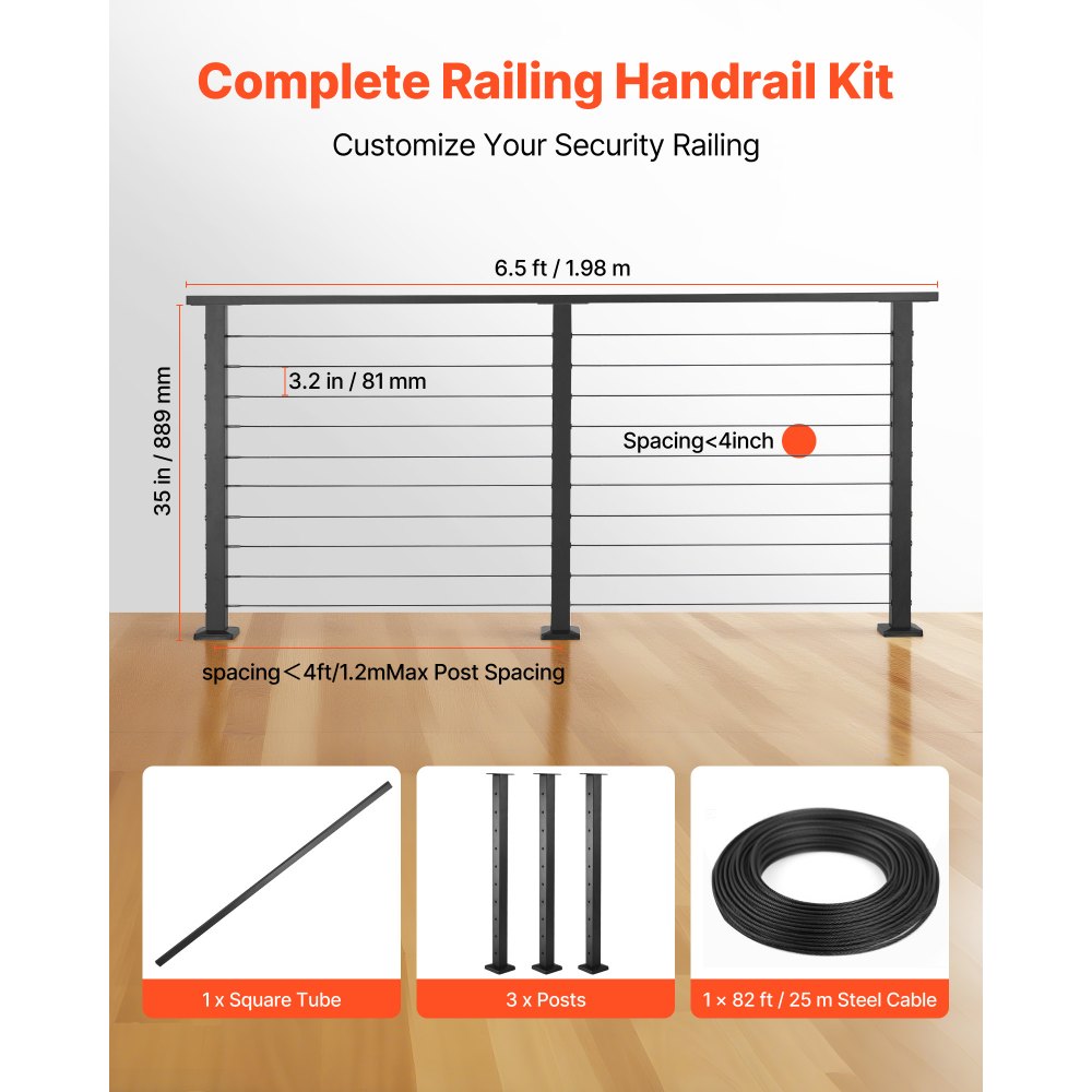 Kit de barandillas: Nuestro kit completo incluye tubos cuadrados, postes y cables para barandillas de seguridad personalizadas. Fácil de instalar y se adapta perfectamente a escaleras interiores, balcones o terrazas exteriores, haciendo que su espacio sea más seguro y atractivo