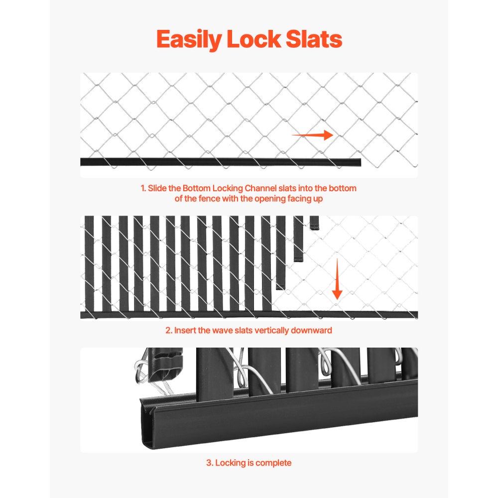 Cerca de eslabones de cadena de cobertura total de 10 pies: Cada caja incluye 82 listones de cerca de eslabones de cadena de pared doble y 3 piezas de canales de bloqueo inferiores de 44", especialmente diseñados para cercas de eslabones de cadena de 10 pies