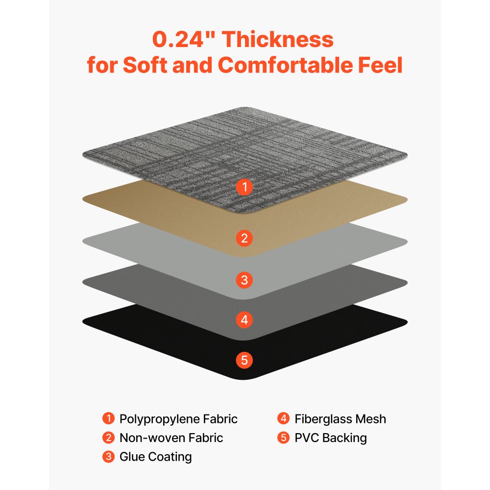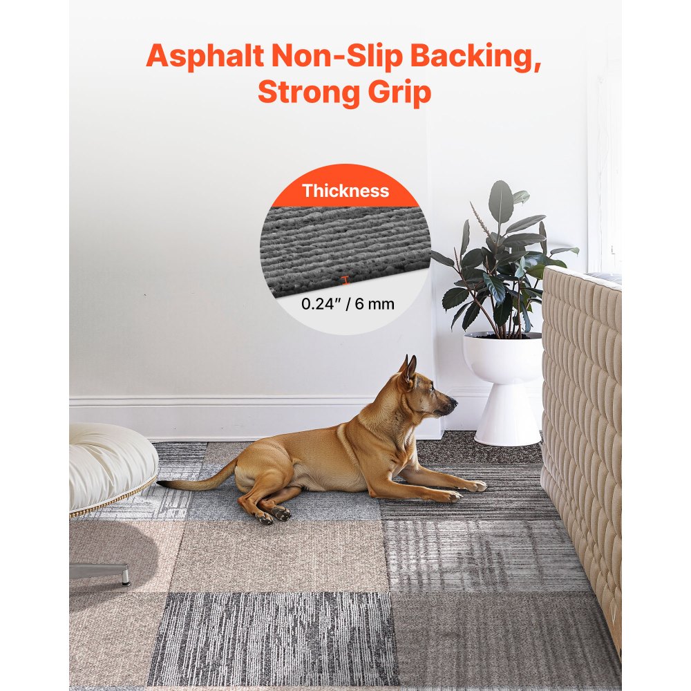 Antideslizantes y duraderas: Estas losetas de alfombra cuentan con un reverso antideslizante que proporciona estabilidad, resistencia y resistencia a la abrasión. Son ideales para zonas de mucho tránsito, como oficinas, pasillos o propiedades de alquiler