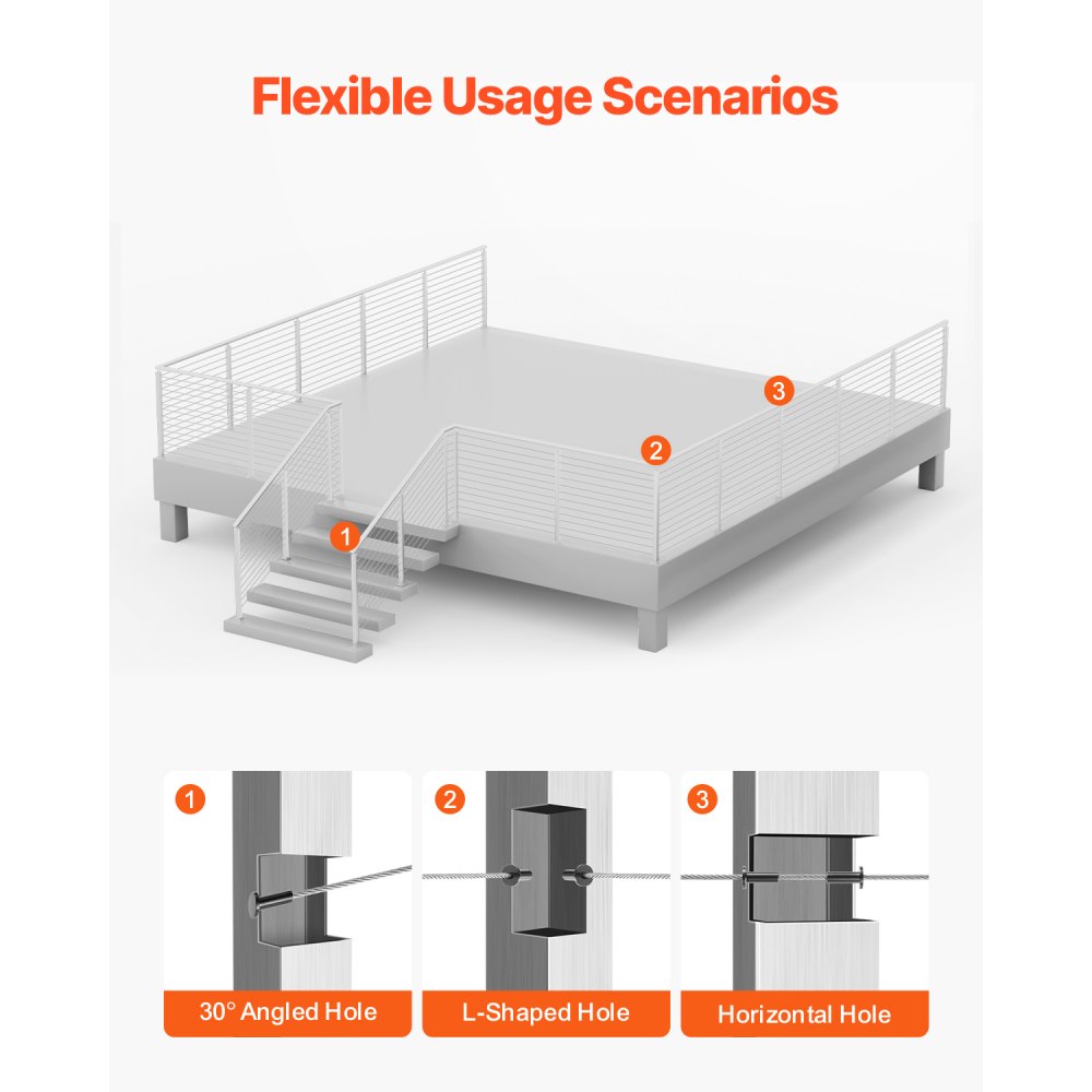 Resistente y duradero: Nuestro poste de pasamanos de cable está fabricado con acero inoxidable SUS304 de alta calidad, que ofrece una excelente resistencia a la oxidación y protección contra la corrosión para una larga duración. Sin embargo, no se recomienda su uso en zonas costeras. Nota: Aplique aceite antioxidante al eje de la barandilla antes del primer uso
