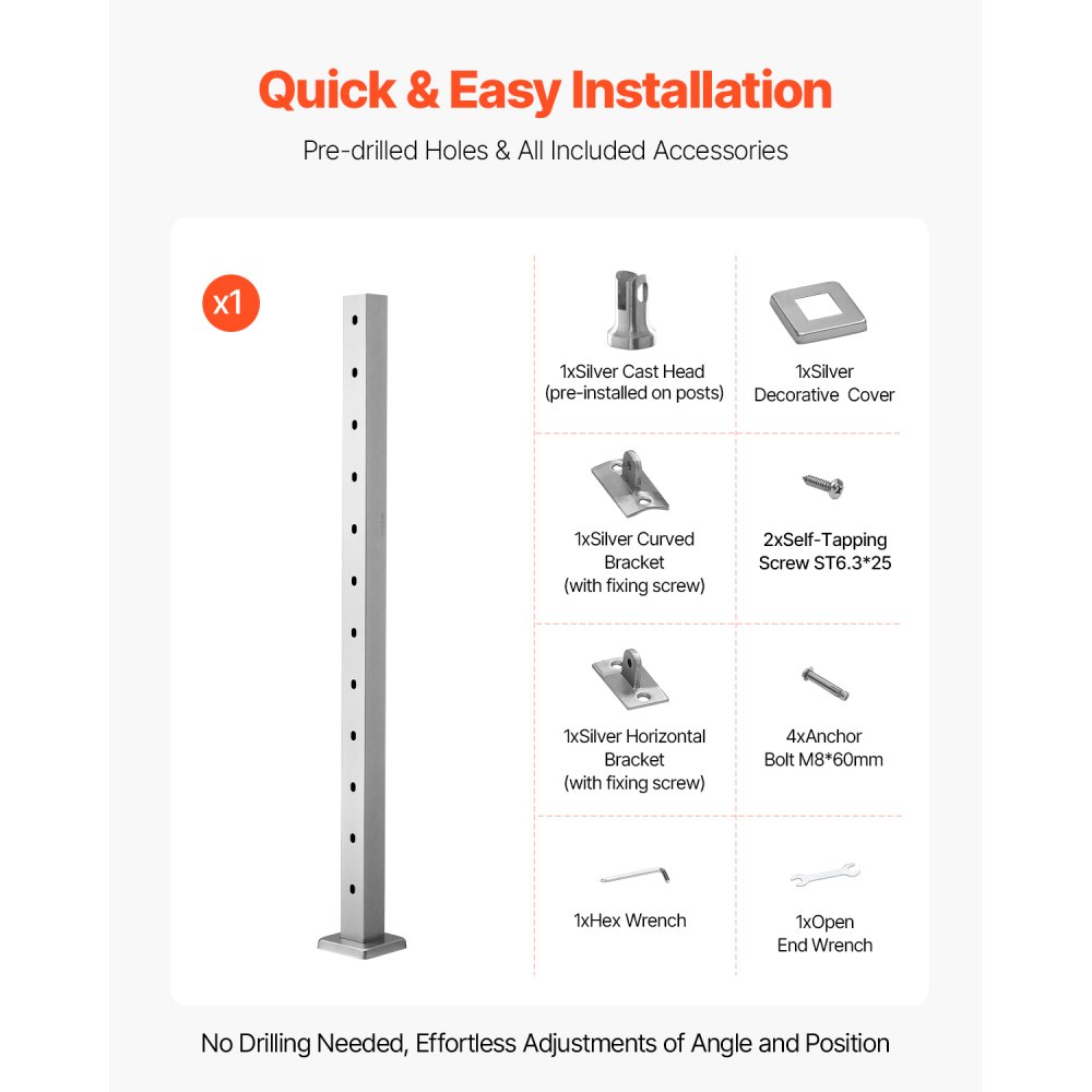 Fácil instalación y bricolaje: Este poste para barandilla de terraza incluye soportes horizontales y curvos, aptos para diversos tipos de orificios. Es compatible con pasamanos de tubo cuadrado y redondo, lo que permite personalizar los ángulos del pasamanos