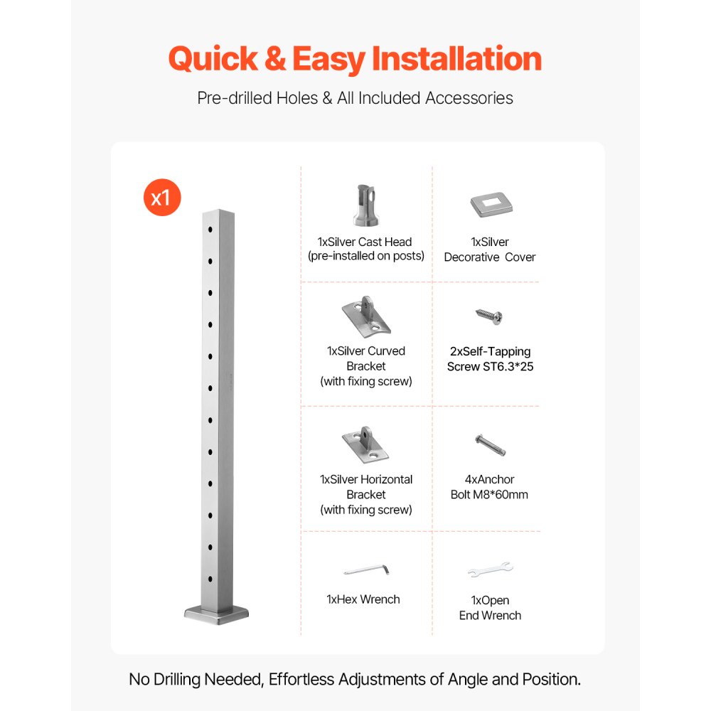 Fácil instalación y bricolaje: Este poste para barandilla de terraza incluye soportes horizontales y curvos, aptos para diversos tipos de orificios. Es compatible con pasamanos de tubo cuadrado y redondo, lo que permite personalizar los ángulos del pasamanos