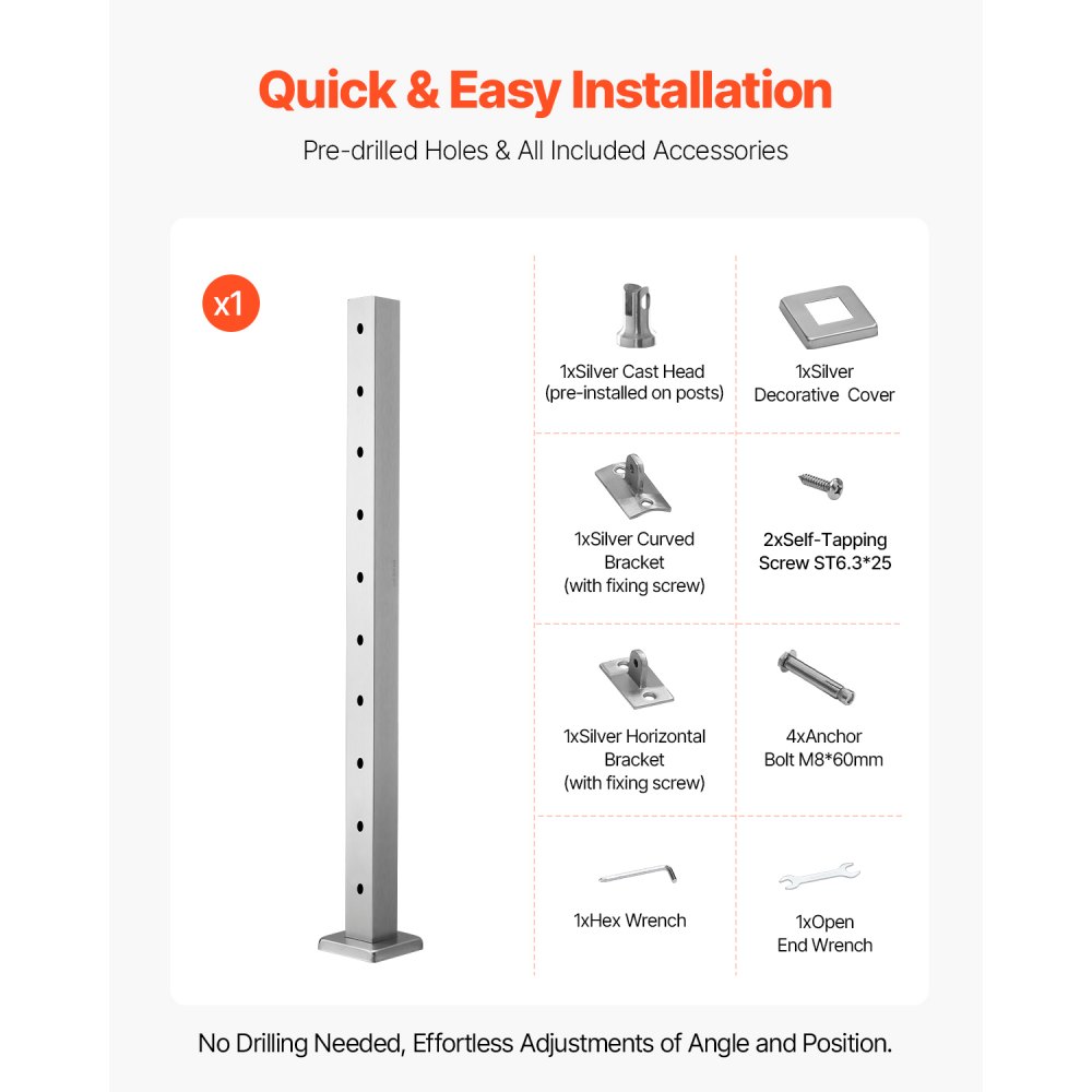 Fácil instalación y bricolaje: Este poste para barandilla de terraza incluye soportes horizontales y curvos, aptos para diversos tipos de orificios. Es compatible con pasamanos de tubo cuadrado y redondo, lo que permite personalizar los ángulos del pasamanos