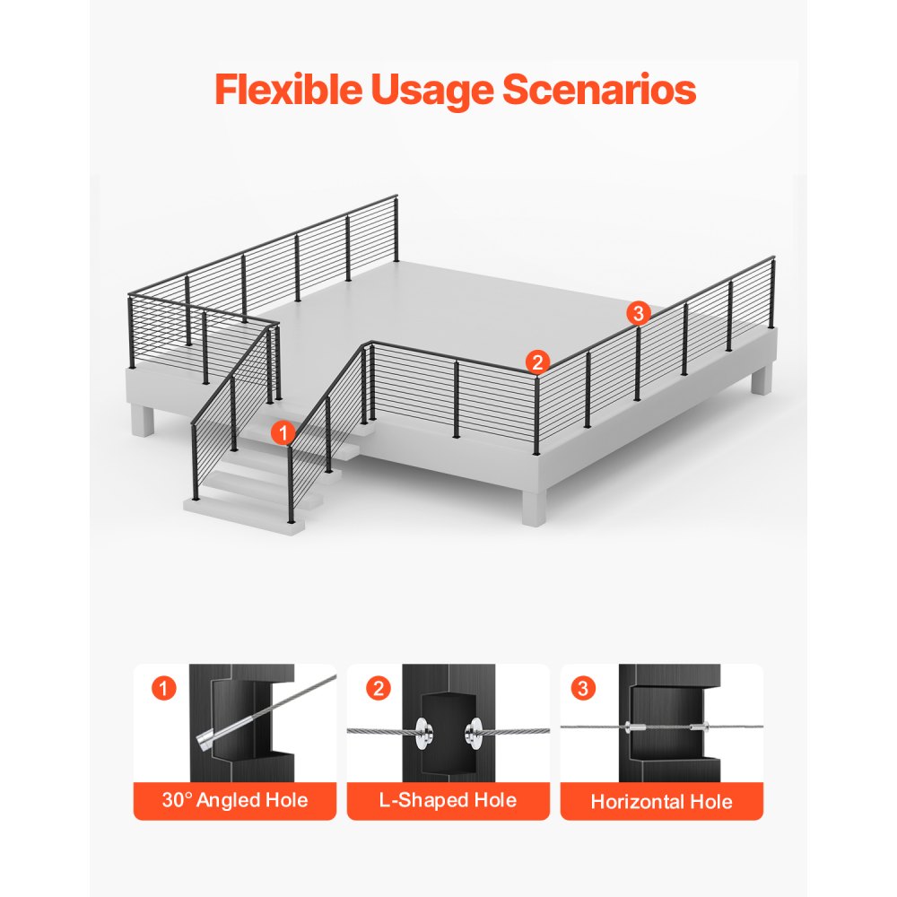 Protección para múltiples escenas: Nuestro poste de riel de cable es adecuado para protección tanto en interiores como en exteriores, incluidas terrazas, escaleras, porches, cercas, patios, balcones, jardines, edificios residenciales, oficinas comerciales, hoteles, garajes y más